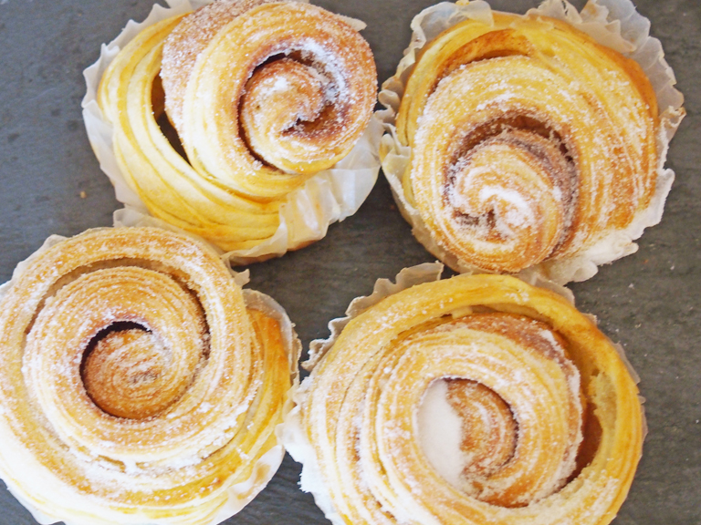 バターと生地を何層にも重ねた生地にシナモンシュガーを挟み焼き上げました