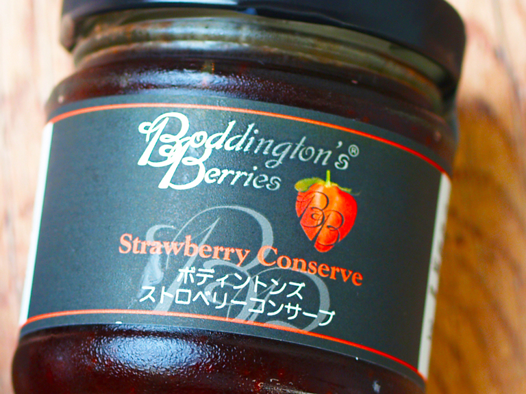 ボディントンズ コンウォールのイチゴ畑の中の工房で、毎日摘みたての苺で作られる。ペクチンなし、煮詰めたイチゴの香りがスコーンによく合う